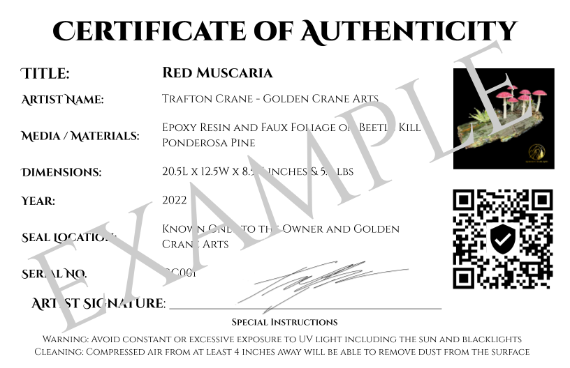 The larger Golden Crane Arts originals will come with a certificate of authenticity, including instructions on how to authenticate if there ever is a question.